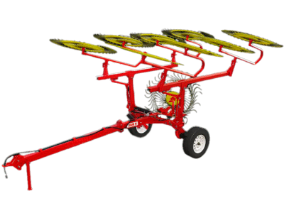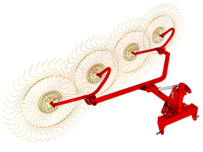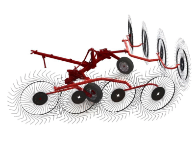- Роторные грабли – оснащены вращающимся ротором с длинными трубками и прутьями на концах. Такая конструкция обеспечивает деликатное переворачивание и равномерное разбрасывание растений, что ускоряет сушку и улучшает качество готового сена.